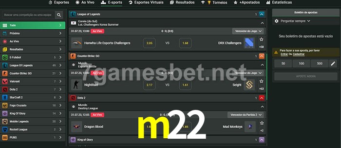 O m22 oferece uma grande seleção de opções de apostas em e-sports com probabilidades competitivas